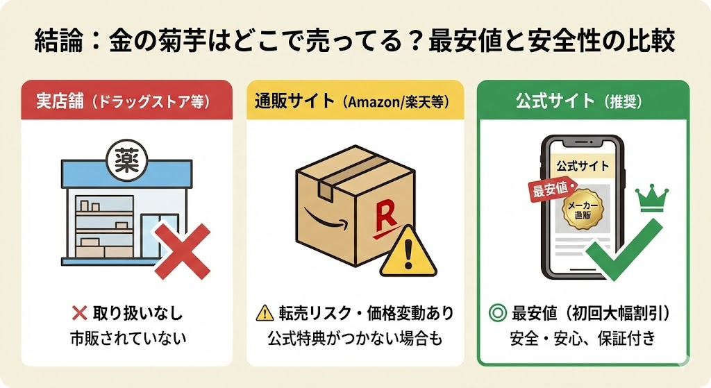 この記事では、私が実際にドラッグストアやバラエティショップを回って調査した結果や、大手ネット通販サイトとの価格比較、そして転売品のリスクまで、「金の菊芋」の販売店に関する情報を網羅的に解説します。
