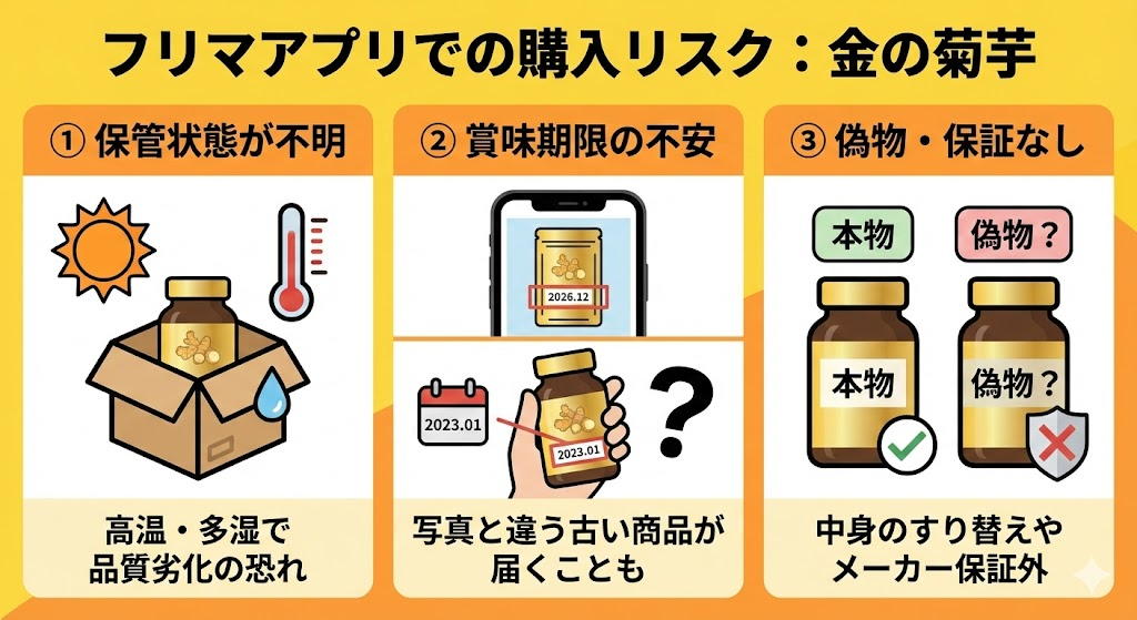 「未開封で安いから」といって飛びつくのは非常に危険です。健康食品をフリマアプリで購入することには、以下の重大なリスクが伴います。