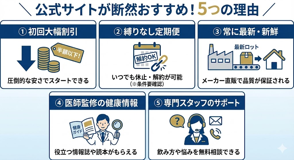 「金の菊芋」を購入するなら、公式サイトが「最安値」かつ「最も安全」であることは間違いありません。その具体的な理由を5つにまとめました。