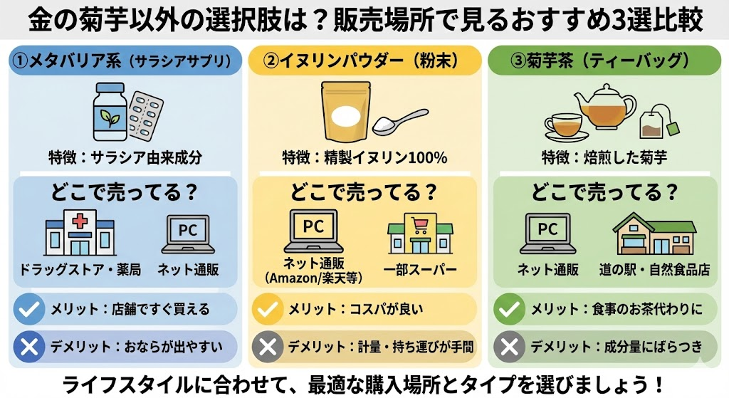 金の菊芋を検討中の方へ、比較対象としてよく挙がる他の商品についても「どこで売ってるか」「買いやすさ」の視点で比較しました。