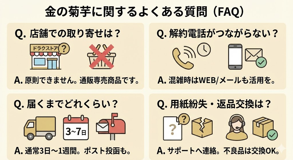 ドラッグストアの取り寄せシステムは、そのチェーン店が契約している問屋に在庫がある場合のみ利用可能です。金の菊芋は通販専売商品のため、問屋ルートに乗っておらず、店舗での取り寄せもできないケースがほとんどです。