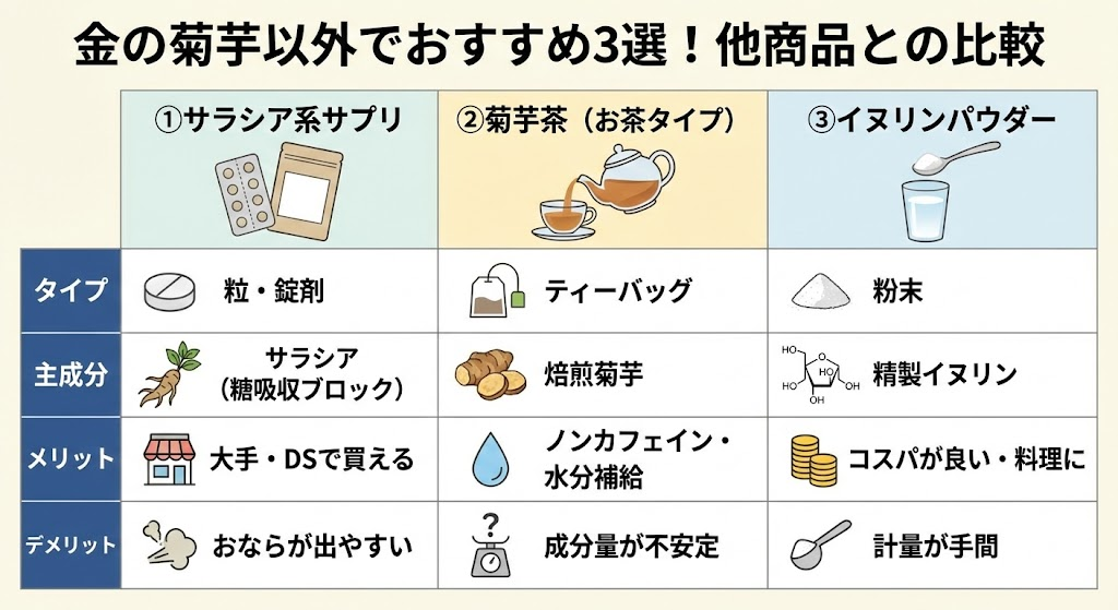 金の菊芋は非常に優れた商品ですが、万人に100%ベストとは限りません。あなたのライフスタイルによっては、他のタイプが適している場合もあります。ここでは、公平な視点でライバル商品と比較します。