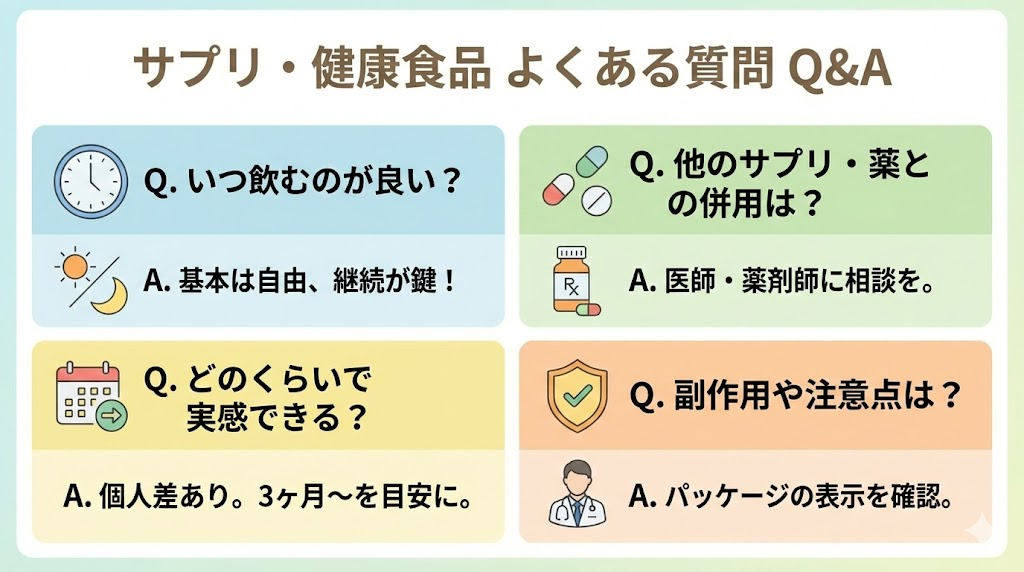 これはサプリメント全般に言えることですが、あくまで健康食品であり医薬品ではありません。即効性を期待するものではなく、長く続けることで日々のコンディションを整えるものです。特にエルゴチオネインのような成分は、体内に蓄積され、長い目で見て健康をサポートする性質があるため、焦らず継続することが重要です。