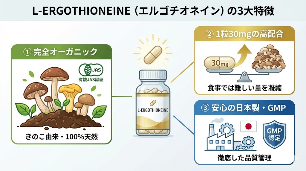 L-ERGOTHIONEINEは、有機JAS認証取得のきのこを原料とし、国内GMP認定工場で製造されています。一般的な化学合成された安価なサプリメントとは異なり、原料の希少性と安全管理にコストをかけているため、どうしても価格は高めになります。この「価格」は、成分への信頼性とトレードオフの関係にあると言えるでしょう。