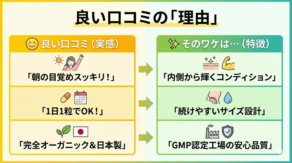 - 良い口コミでは「朝の目覚めの良さ」や「コンディションの安定」、「飲みやすさ」が高く評価されている。