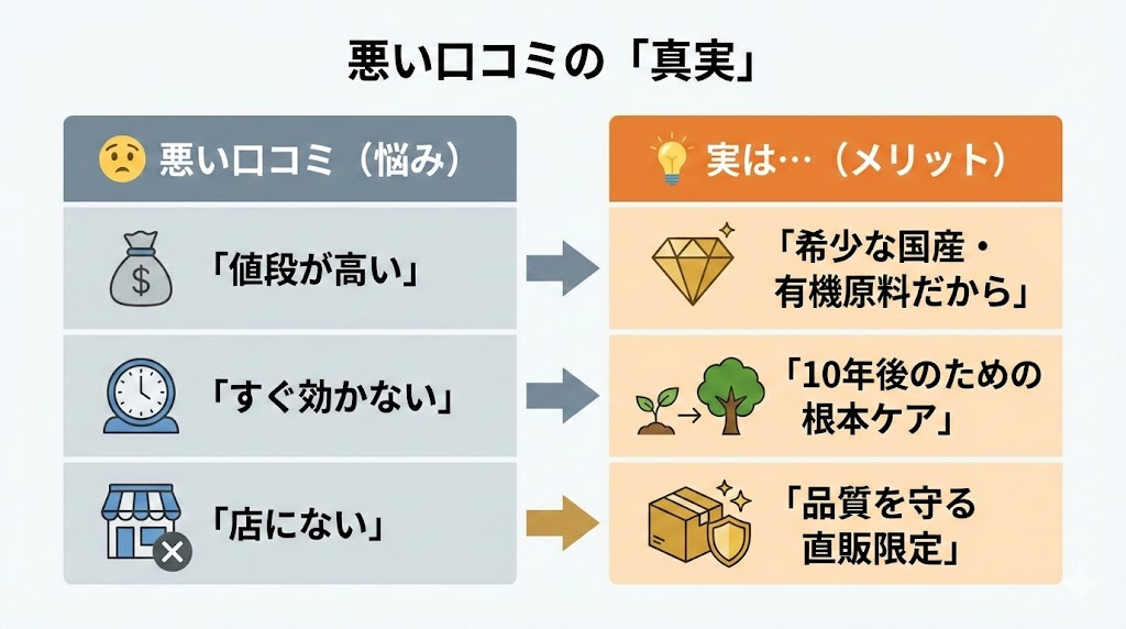 - 悪い口コミは主に「価格」と「即効性がない」点にあるが、これは高品質な原料とサプリメントという特性上、ある意味当然のことである。